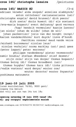adriaan verwée / alda snopek / annelies slabbynck / anton cotteleer / carianacarianne (US) / christophe engels / david bruneel / dirk peers / dirk zoete / doris kuwert (D) / els soetaert / eva-maria bogaert / evert defrancq / gerd ververs / hap / hendrik vermeulen / kaatje lannoo / jan wiels / johan de wilde / johan de wit / johan parmentier / joris van der borght (NCNP) / katrien vandekerkhove / kurt duyck / lieve d'hondt / matthieu ronsse / maud vande veire / michaël borremans / nicolas leus / nicolas verhulst / norma markley (US) / paul gees / peter lagast / peter morrens / philippe vandenberg / pieter vermeersch / samir boudia / stefaan dheedene / stief desmet / stijn cole / stijn van dorpe / thomas bogaert / thomas boïng (D) / thomas broadbent (US) / thomas huyghe / thomas karz (D) / tinka pittoors / vadim vosters / ward denys / wouter cox / wouter decorte / wouter feyaerts / yoshimasa matsumoto