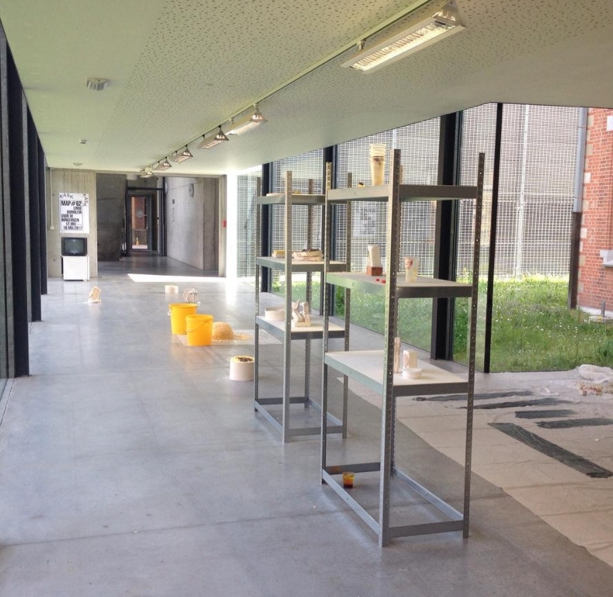 Installatie kunstenaar Linde Dumolein (°1995,BE) bouwt bij voorkeur totaalervaringen in situ. Het liefst met bouwmaterialen en gebruiksvoorwerpen, maar ook voedingsingrediënten ontkomen niet aan haar plastisch onderzoek. Al die elementen samen worden rauw en zonder bouwgeheimen –veelal repetitief van aard- aan de toeschouwer voorgeschoteld. Hoewel haar vertrekpunt de vorm is, komt ze inhoudelijk meestal uit bij het thema van the everyday life.